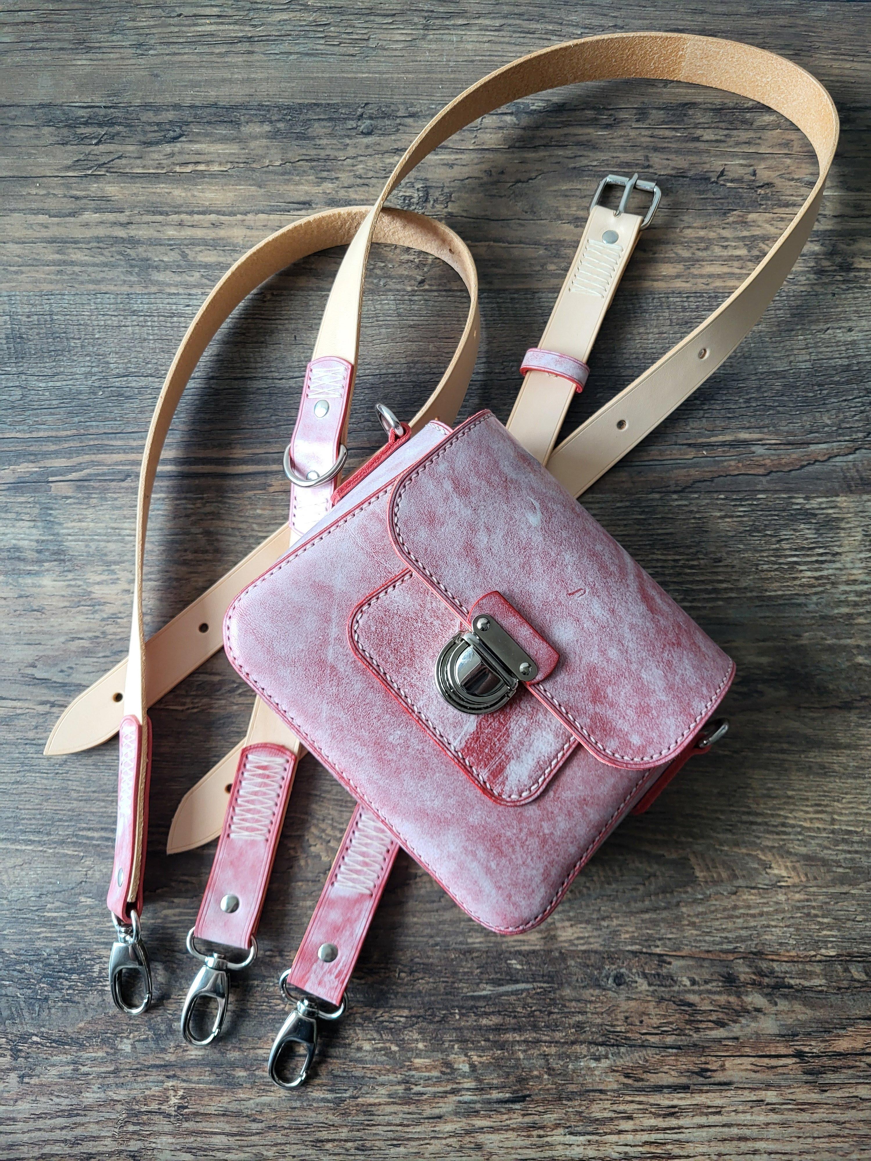 Okrem bežných vzorov, ktoré sa vyskytujú v mojej dielni vznikla na zákazku aj takáto nádherná mini kabelka, pre malú dámu. Aby však mohla slúžiť aj naďalej, keď slečna vyrastie, súčasťou bol aj druhý, dlhší popruh. Ten sa spája s jeho druhým koncom opaskovou prackou. Použitá bola talianska hovädzia koža s vrstvou bieleho vosku na povrchu. Ten sa časom oderie a červenú kožu ešte doleští.