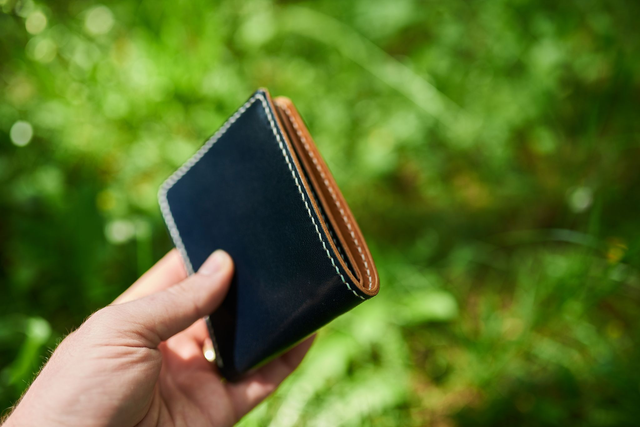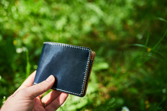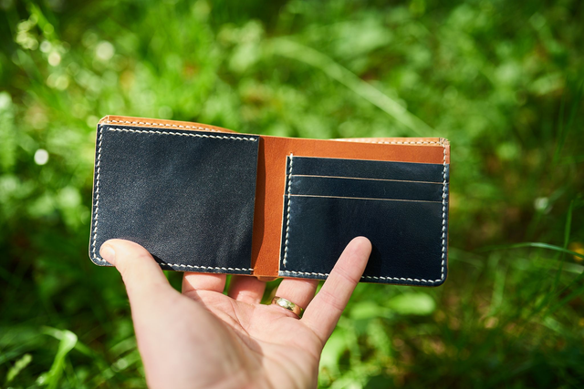 Hovädzia trieslom činená koža v rôznych farbách a kombináciách. Tentokrát bola poskladaná z hovädej trieslomčinenej hladenej kože z Talianska vo farbe Royal Blue v lesklej úprave, v kombinácii s hladenicou vo farbe koňak. Priehradka na bankovky je vystužená prírodnou hladenicou. Všetky tieto varianty majú spoločné: precíznosť, kvalitu a ručné šitie. Kože sú pôvodom talianske, takže hovoríme o veľmi kvalitnom materiáli.