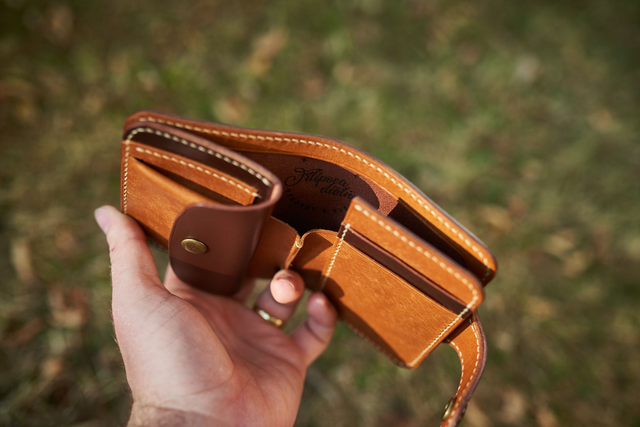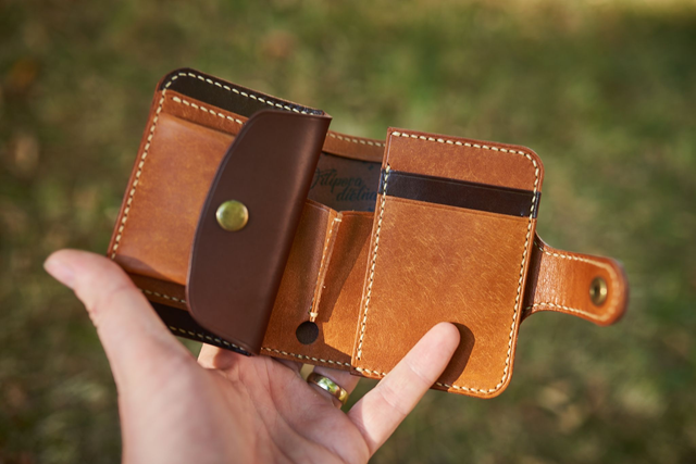 Tuhá, tvarovo pevná peňaženka. Skladá sa z vonkajšej vrstvy - bezchrómovej trieslom činenej tmavohndej hovädzine, ktorej prvky sa prejavujú aj vo vnútri. Vnútro je primárne z hovädzej kože Mexico z talianskej koželužne MB Pellami, ktorá má vzhľad pripomínajúci poškrabanie, čo je jej typickým znakom. Má oblý výrez na vreckách. Po zapnutí je hrubšia - môžete vidieť na fotkách.